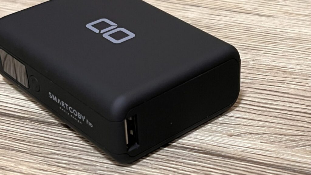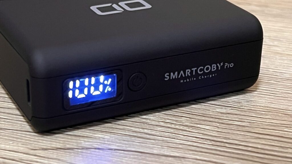 お次は CIO SMARTCOBY。Anker Reduxよりさらにマットな質感。残量はデジタルの数値でパーセント表記。Type-CとType-Aのポートはそれぞれ左右の面に分かれて搭載されています。