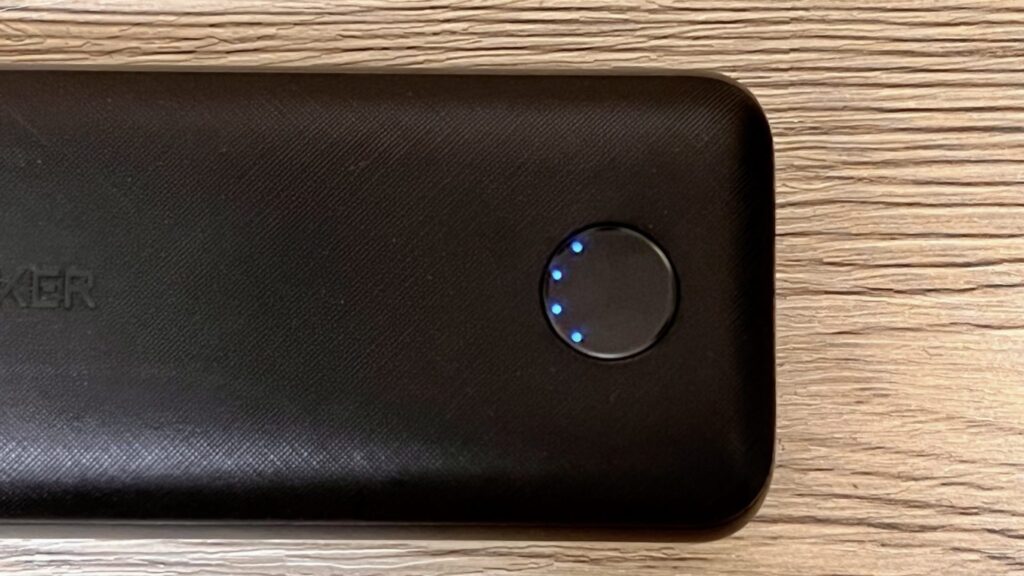 4つのドット型インジケーターで残量を表示。またType-CとType-Aのポートは同じ面に並んでいます。細かいことをいうとストラップをつける穴が空いていますね。(3枚目)