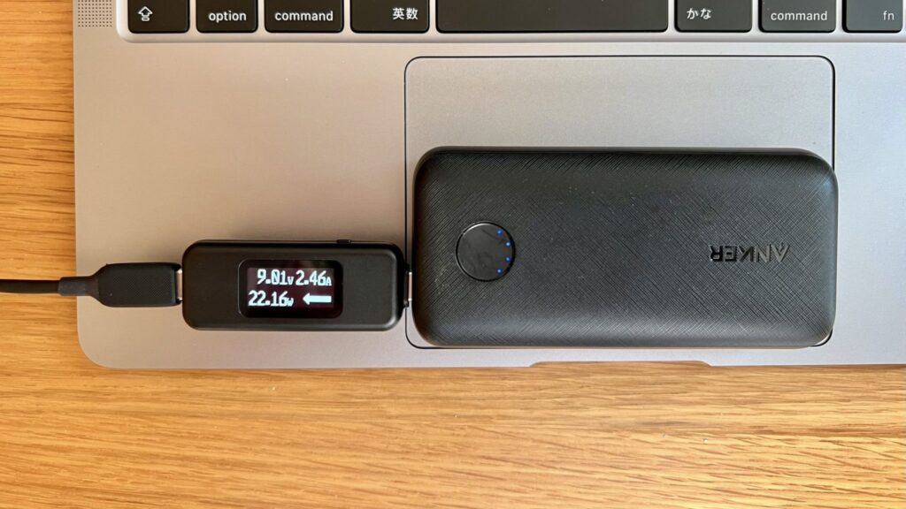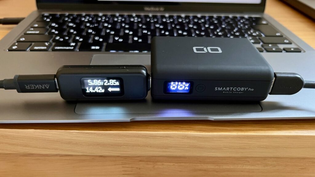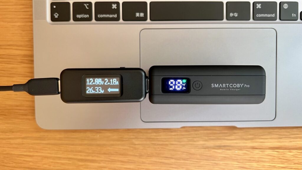 M1 MBAの残充電約20%の状態で、Anker Reduxは22.16W、CIO SMARTCOBYは26.33Wくらいで給電が行われました。スペックどおりCIO SMARTCOBY Pro 30Wの方が優勢ですね。