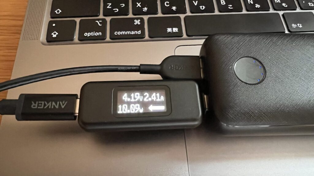 USB Type-CでM1 MBAを充電しながら Type-AでiPhoneを充電した場合、Type-C側の出力はどう変わるか試してみました。結果はご覧のとおり、Ankerは約10W、CIOは約15W。M1 MBAへの給電力という意味ではCIOに軍配です。