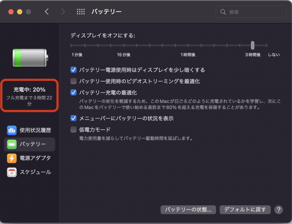 M1 MacBook Airのバッテリーを20%まで減らしてから検証したんですが、まぁMacのバッテリーが減らないこと減らないこと。この時点で、もはやMBAにはモバイルバッテリー不要説すら浮上してきましたが、ここまで記事を書いてしまったのでがんばって充電減らしました。半日かかりました。