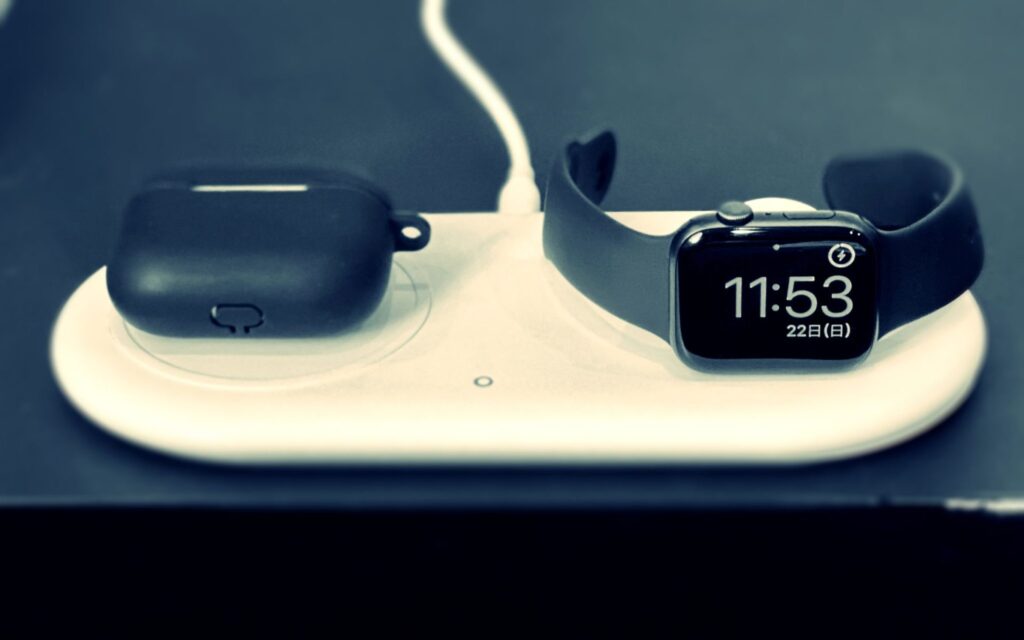MagSafe対応iPhoneとApple Watch用のマグネット充電器。スタンドがついているのが便利。