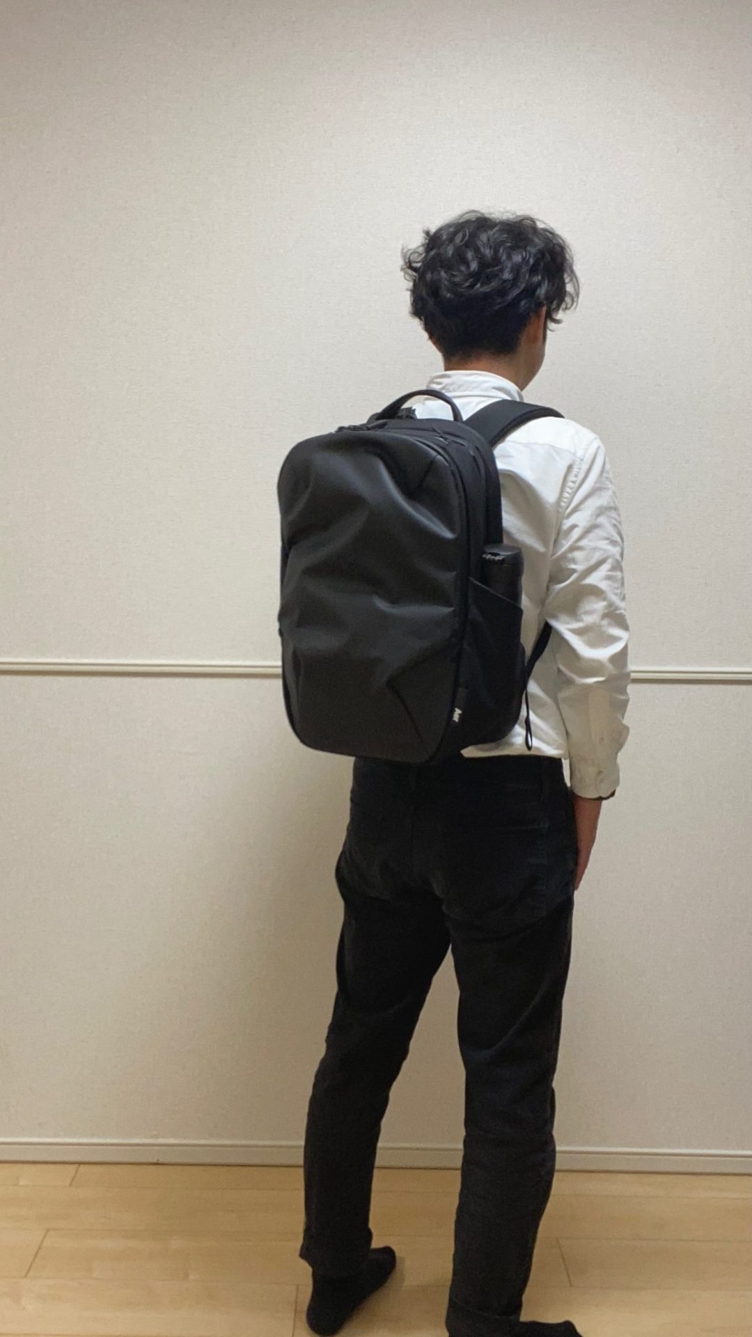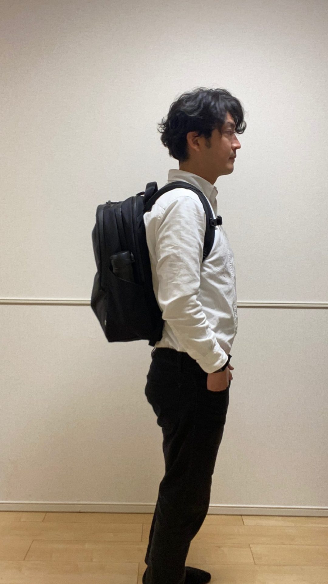 172cm, 67kgの中肉中背(脚短め)のおっさんが担ぐとこんな感じです。厚みはありますが、パッと見デカい!って感じでもないし、絶妙なサイズ感かと。BUSUなのはすいません。