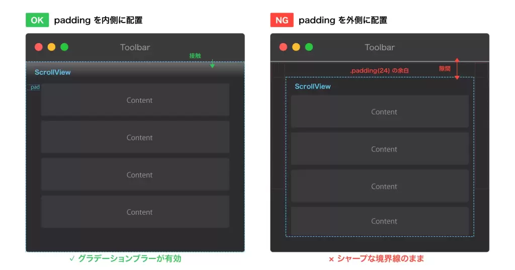 macOS 26 の Liquid Glass では、NavigationStack 配下の ScrollView がツールバーに到達していれば、自動的にグラデーションブラー(スクロールエッジエフェクト)が適用されます。しかし ScrollView の外側に .padding() があると、エフェクトが無効化され、従来型のツールバー表示になる仕様があるようです。