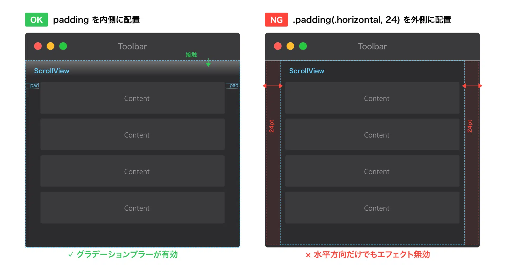 注意点として、水平・垂直を問わず、方向に関係なくエフェクトが無効化されます。横方向だけのpaddingだとしても、無効になることに注意が必要です。おそらく、Toolbarとすべての領域が接していないとダメ、ということでしょう。